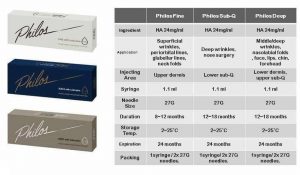 • Philos Deep: Độ cứng trung bình: tiêm cho dáng cằm tự nhiên, má, cằm, rãnh cười, môi lặn mấu với độ bền rất cao.